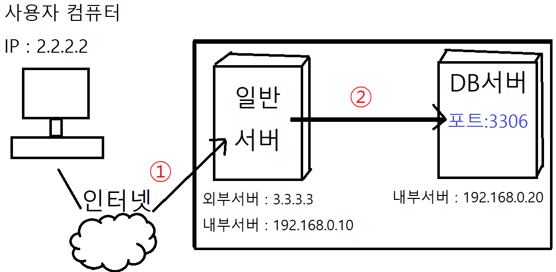 그림1 환경은 DB서버의 3306포트를 접근하기 위해서는 오직 일반서버에서 접근 할 수 밖에 없다.