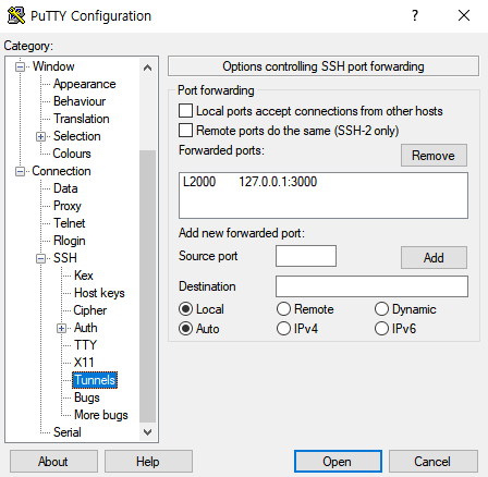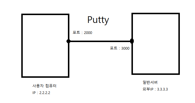 putty를 이용해서 사용자컴퓨터와 일반서버사이의 터널링을 구축한다.