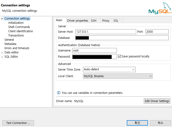 server host는 localhost로 적어야 된다. (이유는 대충 알것 같지만 확실치 않아 아시는분 댓글 부탁드려요)