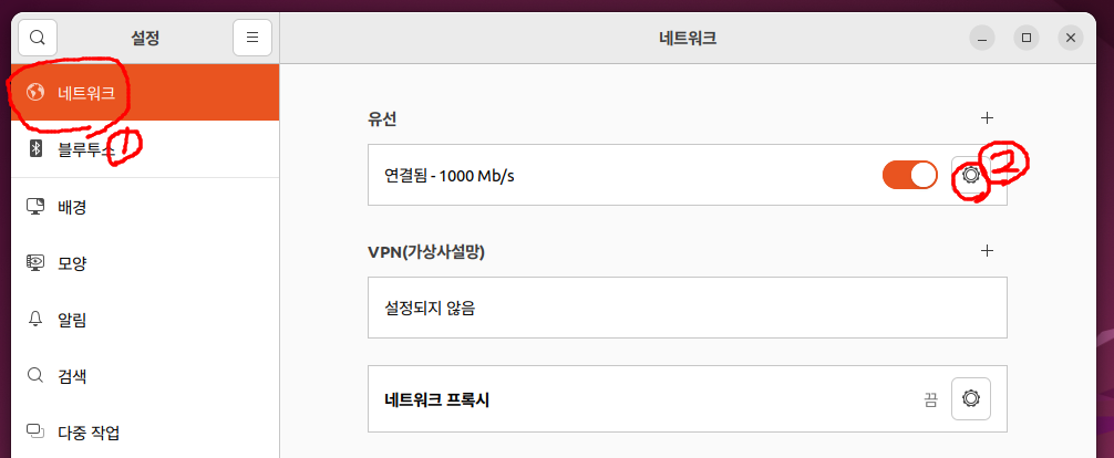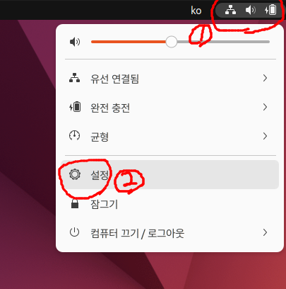 1) 우분투에 접속후, 우측상단 표시클릭후, 설정 클릭한다.