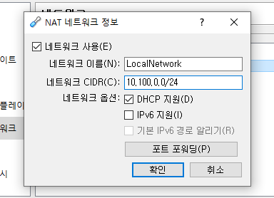 5)네트워크 CIDR도 다음 그림과 같이 입력해주고 확인 누른다. 포트포워딩 세팅끝!