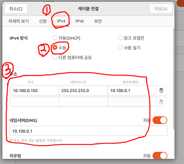 3) IPv4탭에서 방식을 수동으로 바꿔주고, 그림과 같이 아이피 주소를 변경해준다.