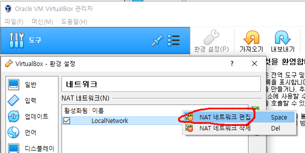 2) 새로만든 네트워크를 오른쪽버튼 클릭후, NAT 네트워크 편집을 누른다.